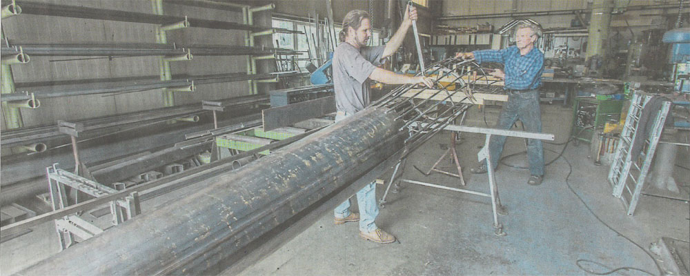 Das Stahlskelett für den sieben Meter langen Flügel von Roger Rigorth (links) wird in der Schlosserei und Kunstschmiede Haus in Münster Auf der Beune zusammengeschweıßt und geschraubt In Fırmengründer Walter Haus fand der Altheimer Künstler einen begeisterten Mitarbeiter. – Fotos: Th. Meier