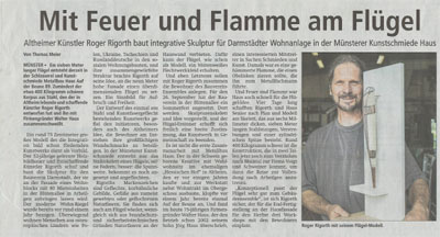 Ein rund 75 Zentimeter großes Modell des die Integration bald schon fördernden Kunstwerks dient als Vorbild. Der 52-jährige gelernte Holzbildhauer und freischaffende Künstler Rigorth schuf und baut die Skulptur für den Bauverein Darmstadt, der sie an der Fassade eines Wohnblocks mit 80 Mieteinheiten in der Blütenallee in Arheilgen anbringen lassen wird. Der moderne Wohn-Riegel wurde bereits vor nınd einem ]ahr bezogen. Überwiegend wohnen Menschen aus osteuropäischen Ländern wie Polen, Ukraine, Tschechien und Russlanddeutsche in den sozialen Wohnungsbauten, und ihre zusammengewürfelte Struktur brachte Rigorth auf seine Idee, an die neun Meter hohe Fassade einen überdimensionalen Flügel zu setzen. Ein Sinnbild fiir Aufbruch und Freiheit. Der Entwurf des einmal aus Stahl und Kunstfasergefiecht bestehenden Kunstwerks gefiel den Initiatoren, besonders auch des Altheimers Idee, die Bewohner am Entstehen ihre großflächigen Wandschmucks zu beteiligen. In der Münsterer Kunstschmiede entsteht nur das Stahlskelett eines Flügels, seine Federn,